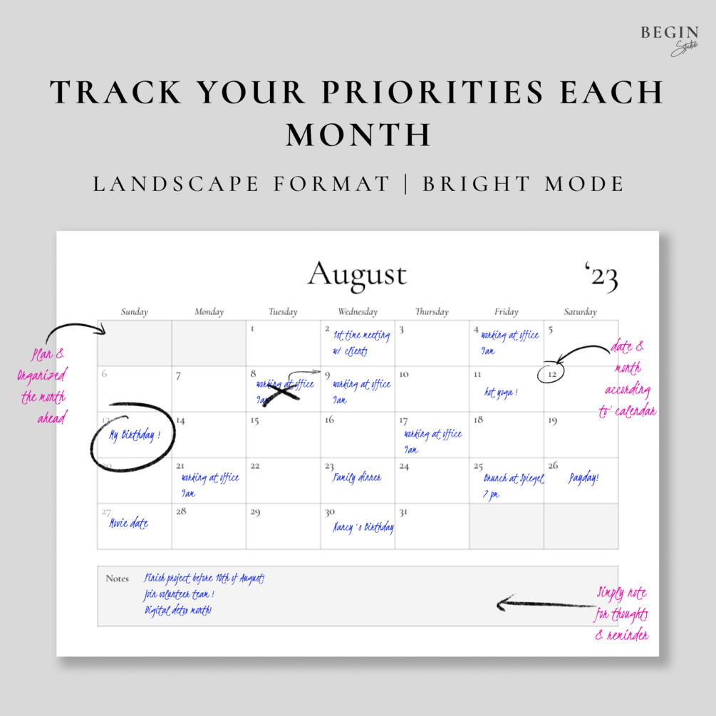 Each month is presented on a single page, with ample space to write down important dates, appointments, and tasks. The simple, yet stylish design makes it easy to read and use, ensuring you stay on top of your schedule without sacrificing your sense of style.